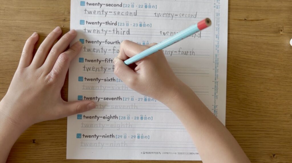 3回書いただけで覚えられるものではありませんが、英語のスペルは漢字の練習と同じように、繰り返し取り組む中で少しずつ定着していきます。