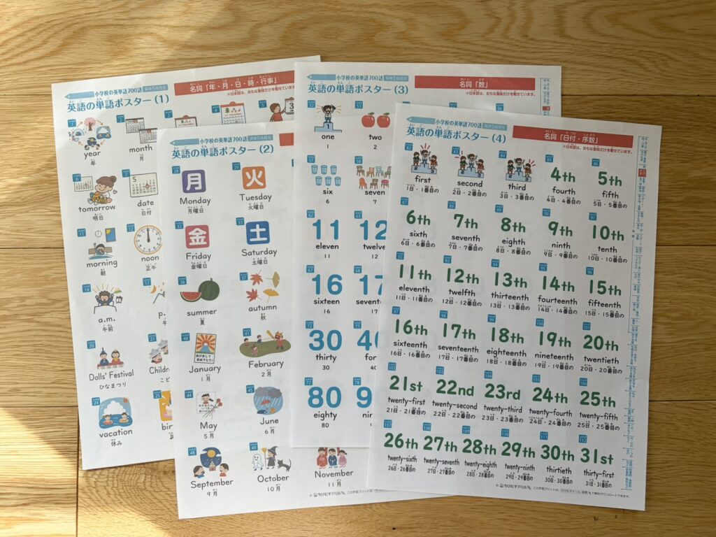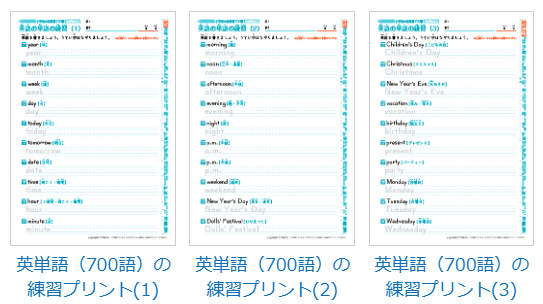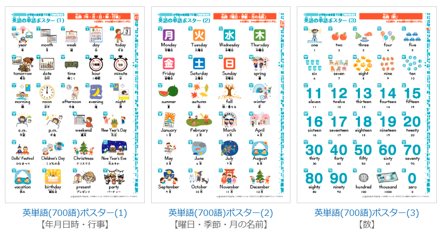 ちびむすドリル英語では、小学校の教科書に出てくる英単語700語が①ポスターと②練習プリントとしてまとめられています。
