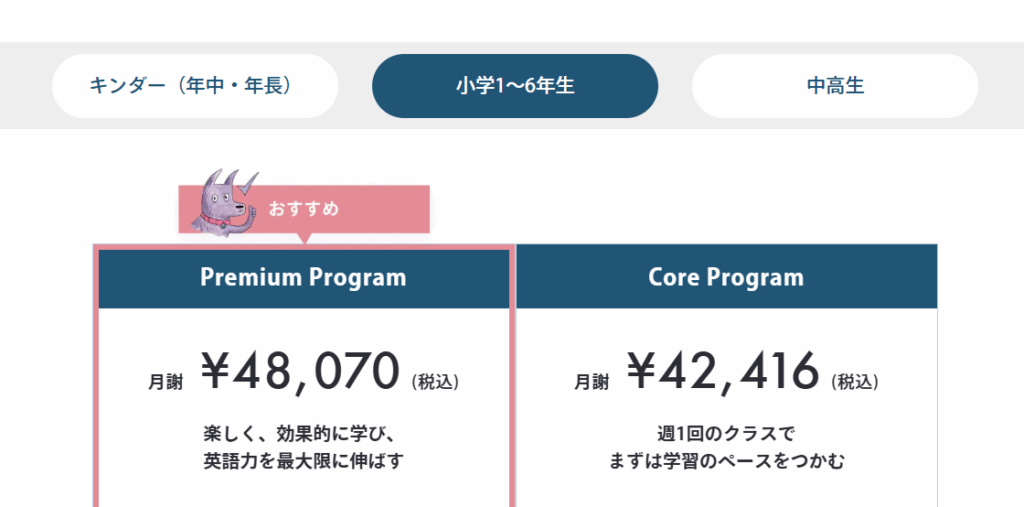 - この年齢層では、英語の基礎力を楽しみながら身につけることに重点が置かれており、比較的リーズナブルな料金設定です。