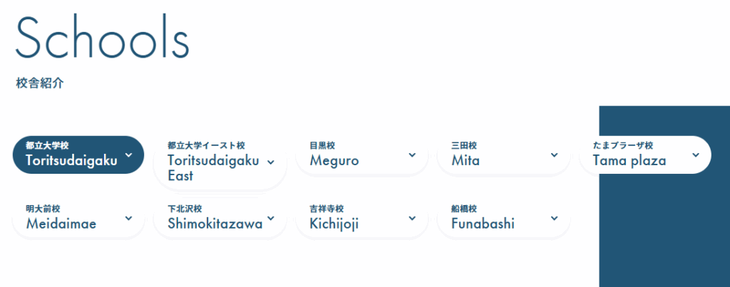 神奈川県にはたまプラーザ校が、千葉県には船橋校があります。いずれの校舎も交通アクセスの良い駅近くに位置しており、通いやすさにも配慮されています。