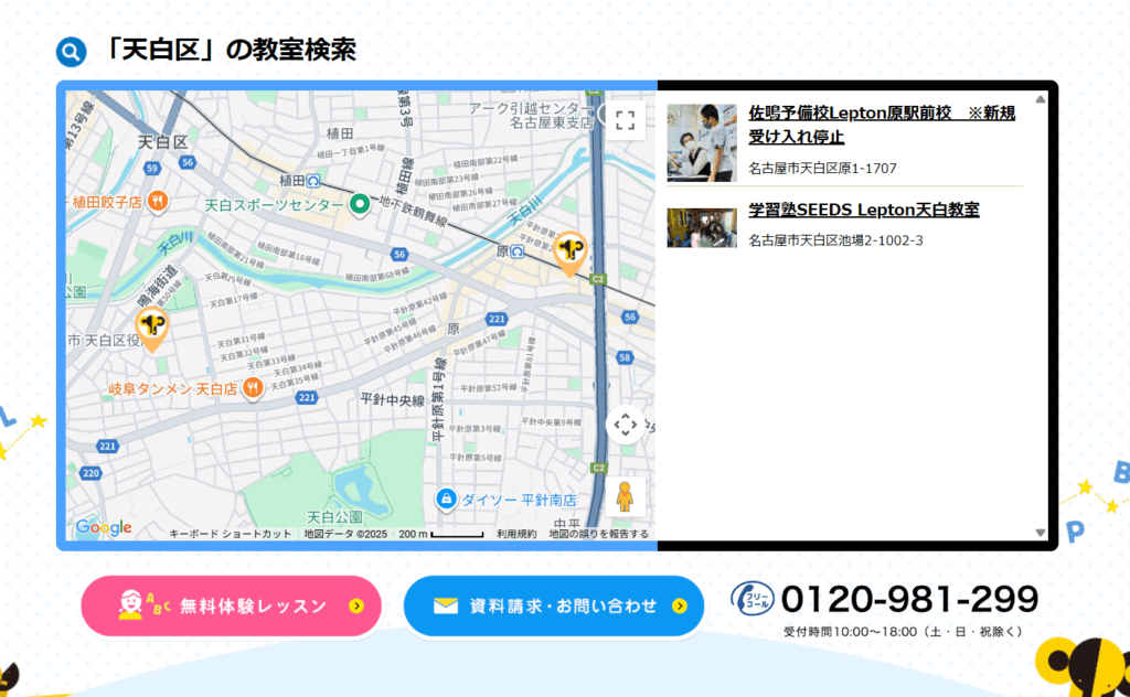 地域名(天白)を入力するだけで、天白区周辺にあるレプトン導入教室を一覧で確認できます。